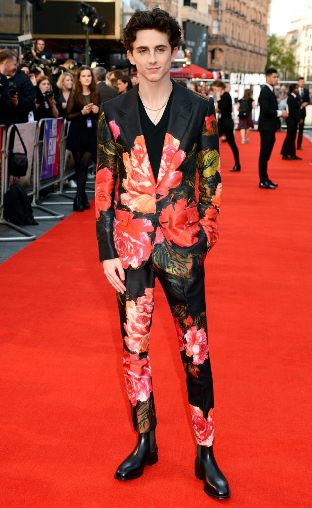 Chalamet is a 22-year old that is slowly taking the red carpet by storm. He does not have a stylist but always look great at the red carpet. He showed up to the Premiere of ‘Beautiful Boy’ in London dressed in a floral Alexander McQueen suit. Harry Styles inspired his style.