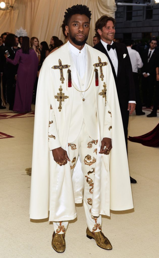 2018 has been a great year of fashion for men just as much as women. The Black Panther star looked great for the Met Gala red carpet. Chadwick stunned in the creative suit with cross signs.