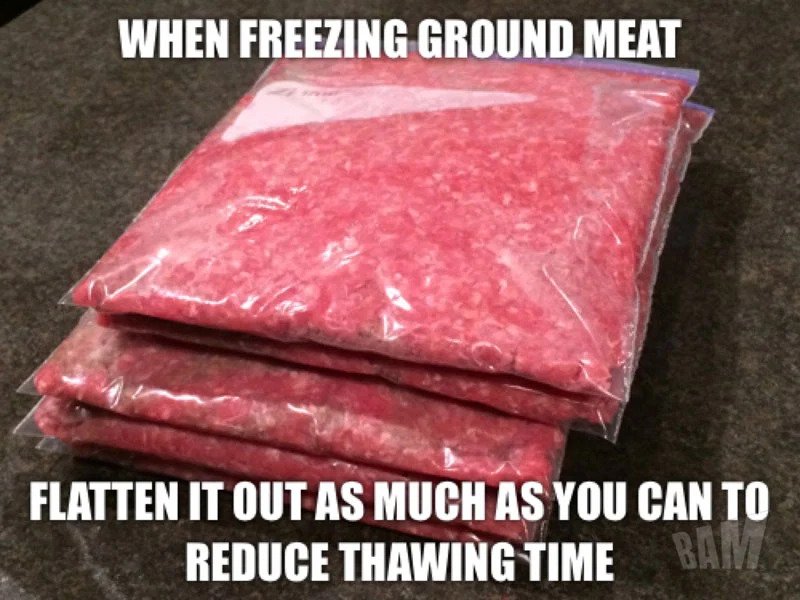 Flattened meat will reduce de-thawing times. If you want to cook your meat right when you need it, consider this simple life hack!