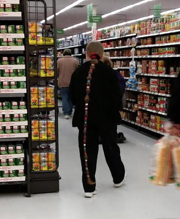 We’re actually really impressed by the length of this lady’s hair. We’re also impressed by the consistent curls. A part of us has to wonder, though, what the point of it all is. Is she a diehard Rapunzel fan? Does she love Ramen noodles? Is she hiding something beneath those curly locks? We will say this, for all of the extreme hair that you’ll find in a superstore, at least hers looks clean!