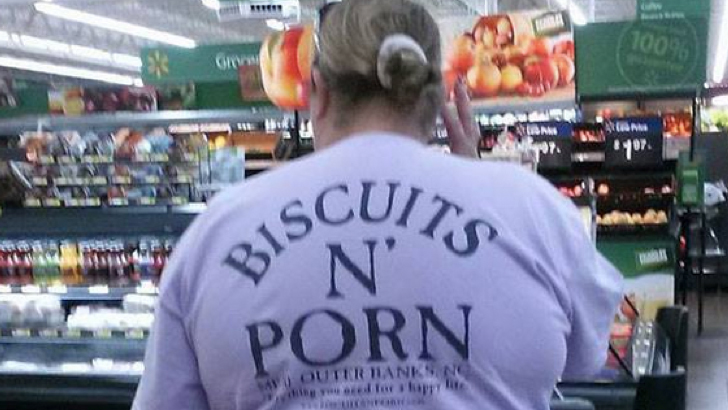 If you grew up kind of poor, you likely are already familiar with the infamous ‘Shirt’. Superstore shirts can come in a variety of different styles and designs. What holds these shirts together, however, is the fact that they have some kind of absurd text on them. We never see people actually wear these shirts, at least not usually. Here, we see this mad lad wearing a superstore shirt IN a superstore. Amazing!