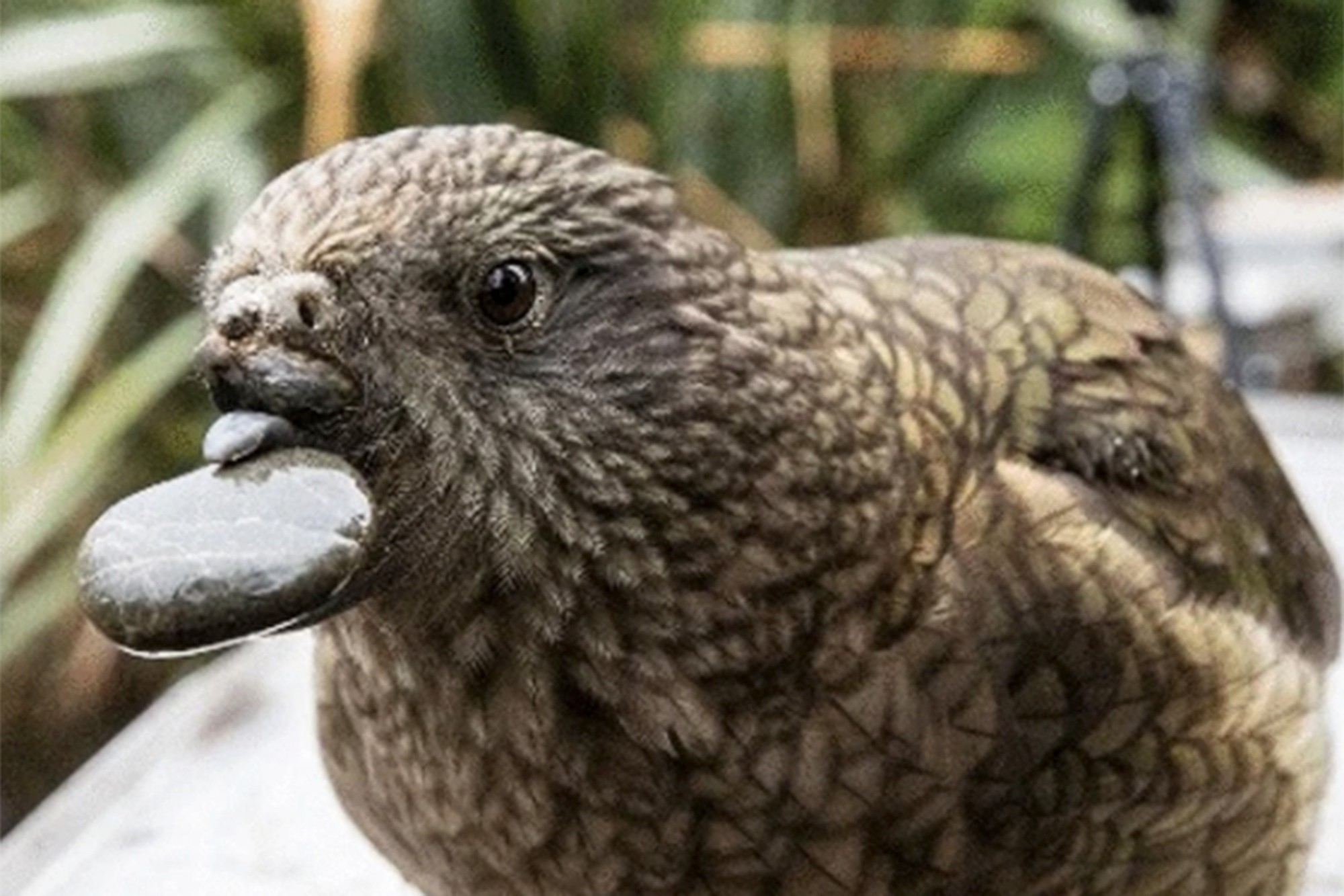 The first example of Bruce’s adaptivity was his cleaning efforts. Keas normally use their beak to clean their features and get rid of bird mites. Bruce wasn’t so fortunate, so he decided to use pebbles instead. Figuring out how to hold the small stones, the bird preens his feathers effectively and continued to do the same behavior, extremely unique and never seen before in a kea parrot.