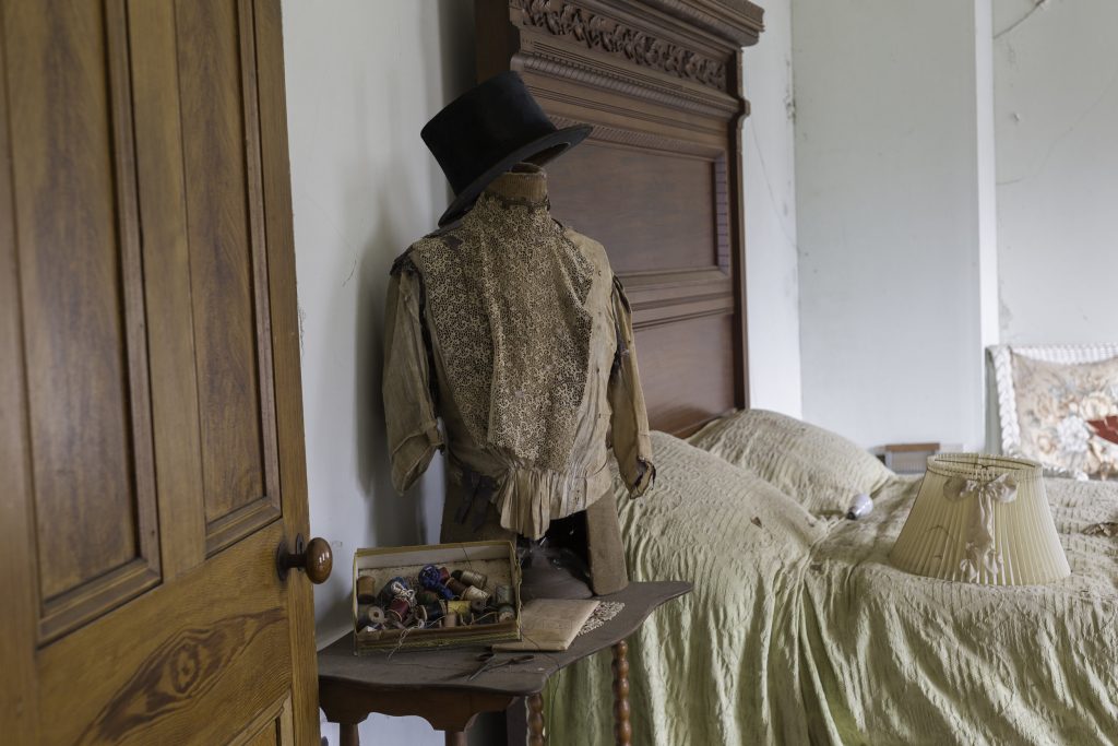 A blouse on a mannequin and a container with spools of thread were seen in the home’s main bedroom. Ms. Carll appeared to be a great stitcher.