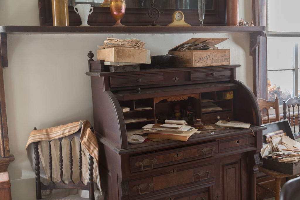Carol probably worked at this desk. While growing up in the farmhouse, she was enrolled in a single-room schoolhouse. Carll attended high school in Jamaica, Queens, then returned to her home town as an educator.