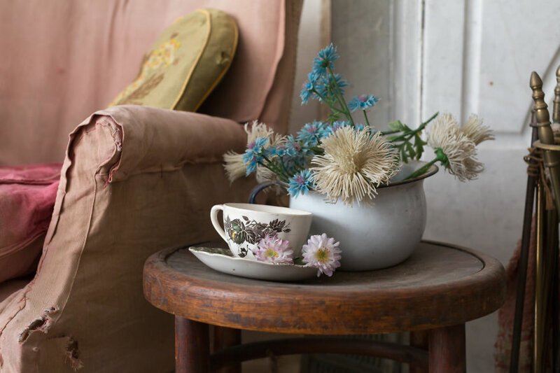 These artificial flowers have withstood the test of time. Their colors are still rich and bright. A teacup sits next to the flowers as though awaiting someone to drink from it.