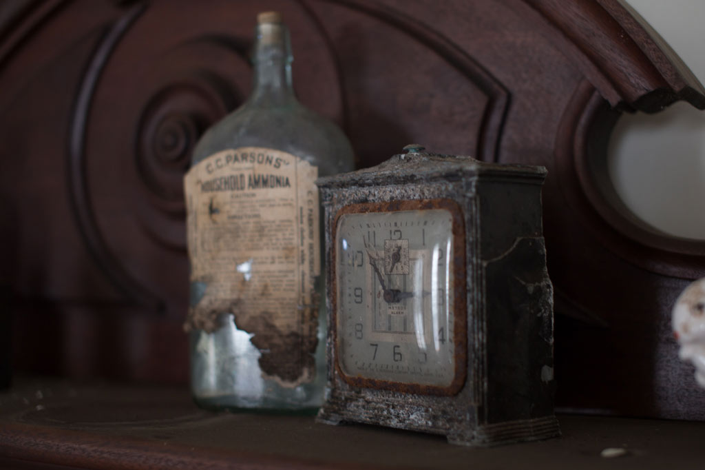 This alarm clock has hands frozen in time at 2:54. Next is a glass bottle that once held C. Household ammonia, a prominent home cleaning agent.