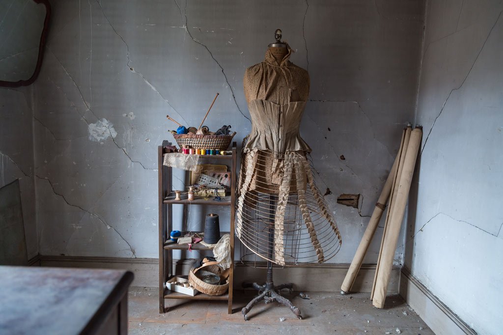 The walls have many steel crinoline dresses hanging from the wall. This under-skirt gained popularity throughout Europe and North America after being patented in the mid 19th century. Given their age, these seem to be in excellent condition.