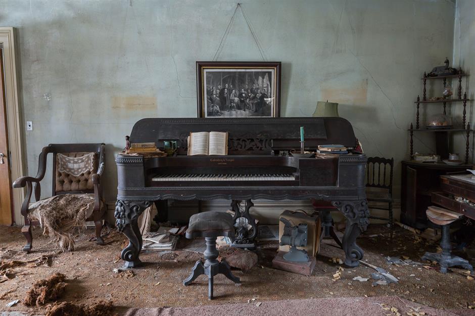 Even with all the dust and debris buildup, this room is a replica of when Marion Carll lived there. This finely carved piano played some lovely music for several years.