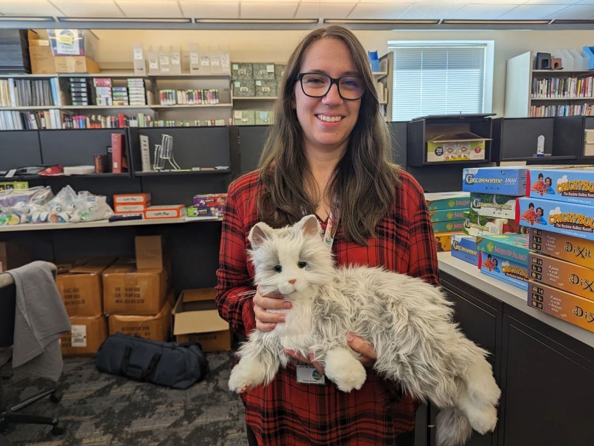 “We have three that circulate,” explained librarian Berry, holding one of the fuzzy robot kitties. “We have one in each branch. They all look the same, but they do have particular names to them. If you’re curious, they’re Bandit, Mr. Pickles, and Percival. Those names were chosen by the staff.”