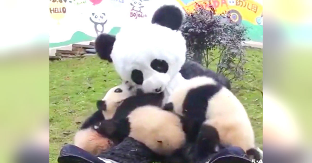 Giant Panda Cubs goof around with “Mom” not realizing parent is really a zookeeper in costume