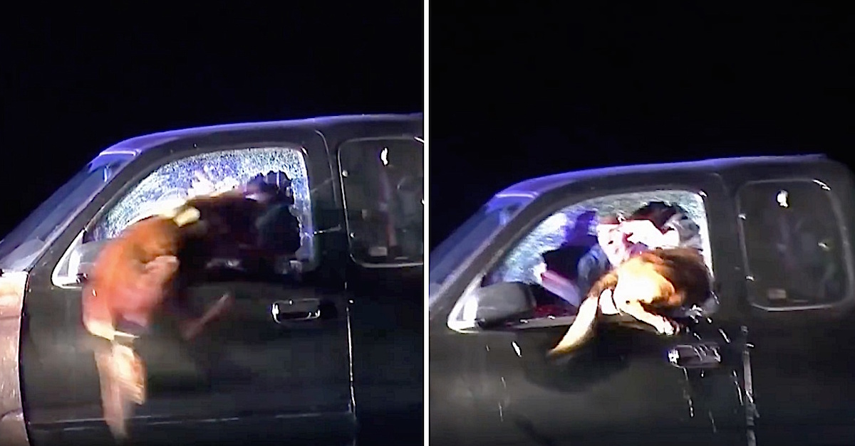 At that point, the police fired rubber bullets into the driver’s side window, breaking the safety glass. Then Duke did a mighty jump straight through the shattered window to nab the suspect, who stood no chance against the mighty jaws of the Belgian Malinois police dog.