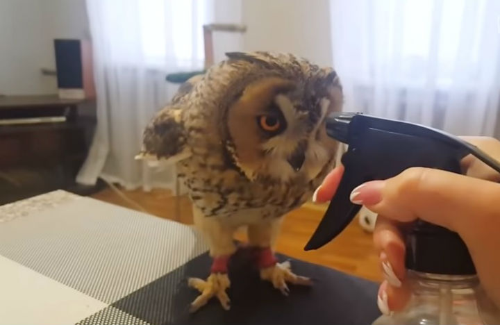 From this bottle, the owl takes a drink of water to quench his immediate thirst. Afterward, he is in the mood to play with his water. He allowed the owner to take a few quick sprays to excite him and then the owner interacted with the owl as if it were a game.