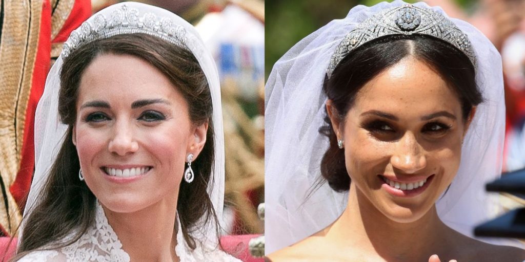 No wedding dress is complete without the veil and the tiara to keep it in place. Believe it or not, the veil is a historical tie back to ancient times and dress. While the west might be very separated from the Middle East, the veil is clearly a historical connection back to ancient times carried through to modernity via custom and tradition. Kate Middleton’s tiara was designed by Cartier and came from Queen Elizabeth. Meghan Markle’s tiara was also provided by the Queen, but her’s was a Bandeau design. Markle added a change and had a sapphire placed in the middle for her specific look.