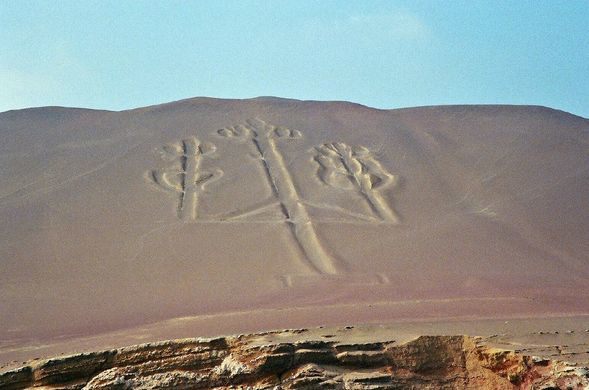 The Paracas Candelabra is also called. the “Candelabra of the Andes.” This mysterious glyph is located on the face of the Paracas Peninsula in Peru and is over 600 feet high. Despite its common name, archaeologists do not really believe that this geoglyph was created to resemble a candelabra. The three-pronged design of this geoglyph more likely resembles a trident — to pay homage to Viracocha, the trident-wielding Incan creator god — or Jimson weed — a hallucinogenic, which was commonly used in religious rituals. Because of other nearby archaeological finds, the Paracas Candelabra is believed to be dated back to around 200 BCE.