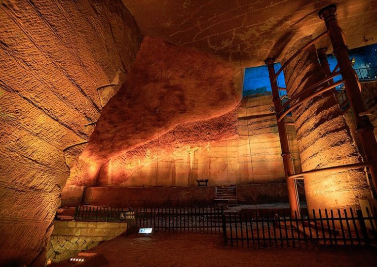 These caves appear to have been deliberately carved in sandstone over 2,200 years ago, with some over 100 feet tall. There are carved bridges, pillars, etc throughout the extensive cave system. How was it built, and why?