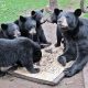 Giant Panda bear cubs attack their mom as she sits on the grass. The frisky young bear cubs play and snuggle with her. One cub even bites...