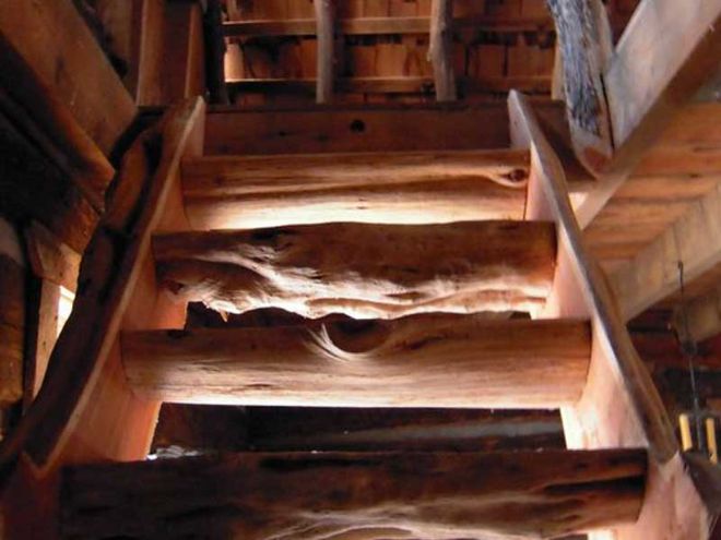 The family found a very large tree that had fallen in the nearby woods and decided to use it to create a natural staircase. The oak steps were carefully cut, sanded and finished. Now, they lead the way directly to the “upstairs” sleeping loft.