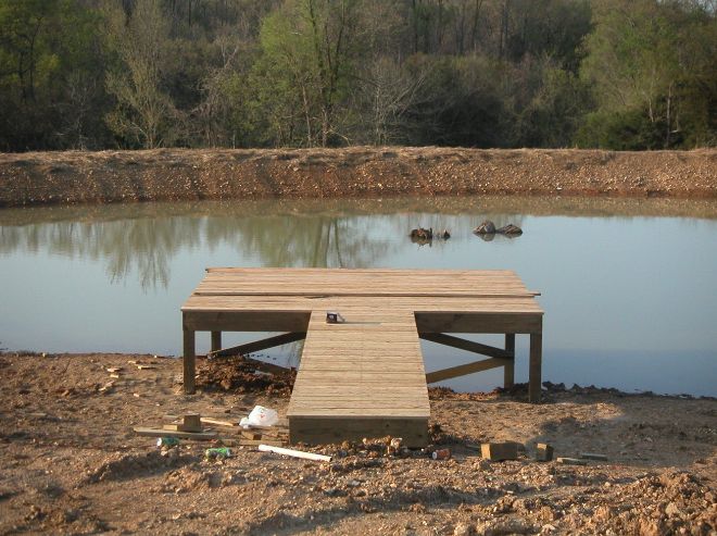 After finding a natural spring while he was digging nearby, Richard decided to enlist his family’s help. They dug with shovels and even brought in a small bulldozer to cut out a space for the water to flow into. Now the property’s front wall looks out onto a large pond that is filled by the spring. They even built their own dock right on the water.