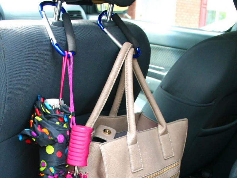 Upon stumbling upon this brilliant trick, I discovered the remarkable benefits it offers. Here’s how it works: simply attach a carabiner to the headrest of the front seat and loop the handles of your purse through it. The carabiner serves as a secure hook that keeps your purse suspended within reach, ensuring everything stays neatly organized and easily accessible during your drive.