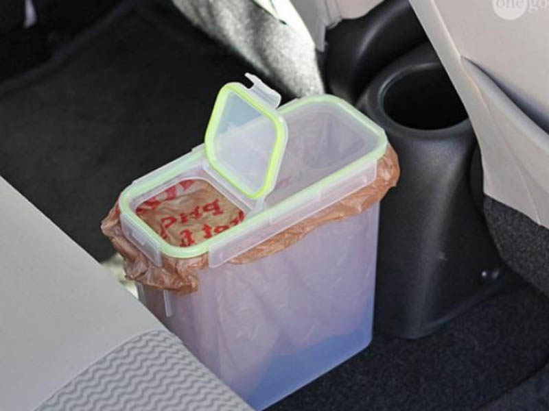 Trash always accumulates in the car. And if you have kids, it’s tenfold. A cereal storage bin is an excellent solution to keep your trash contained and very easy to dispose of. Just line the bin with a plastic bag and position it in an easy-to-reach place. The smell will also be contained and once it’s full, the disposal is simple.