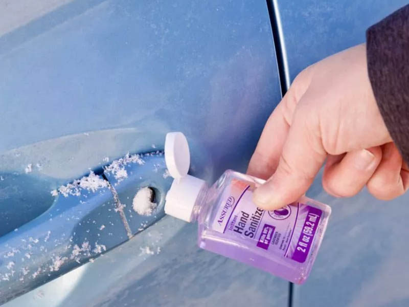 Ice builds up on metal quickly when your car is outside in the winter. Sometimes the build-up can be so thick, that you are unable to get your car key in the door. Hand sanitizer is great for this situation. The alcohol in hand sanitizer helps melt the ice. And if you think of it at the end of the night, you can proactively apply hand sanitizer to your locks to prevent ice from forming in the first place.