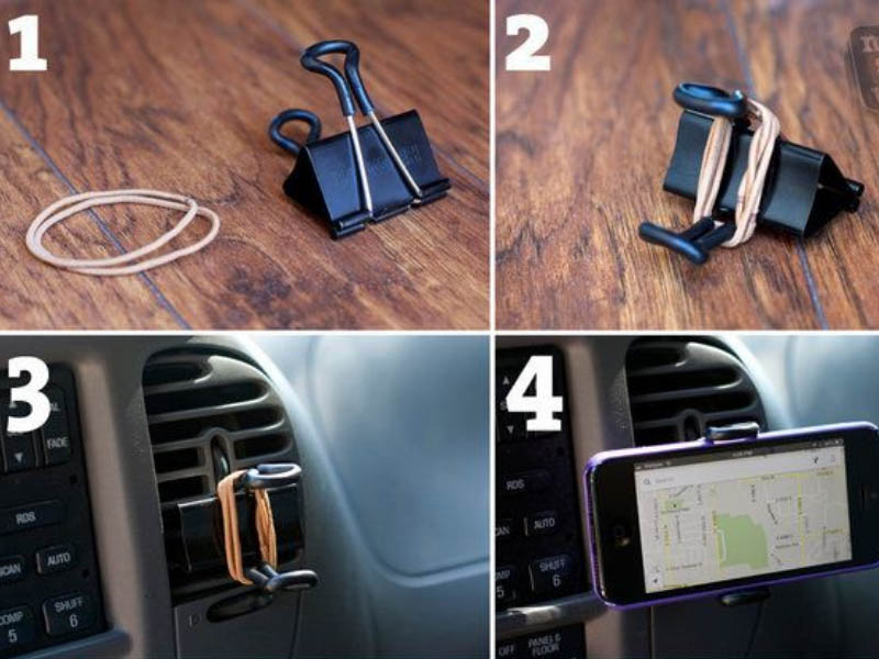 There are two ways to use a rubber band to create a phone holder. The first one involves using a binder clip (as pictured), wrapping a rubber band around it to create tension, and clipping it to your vent. Another more primitive option that works great in rental cards is just looping the rubber band through the top of the air vent and out the bottom. Then just stretch the rubber band over the top and bottom of your phone to hold it in place.