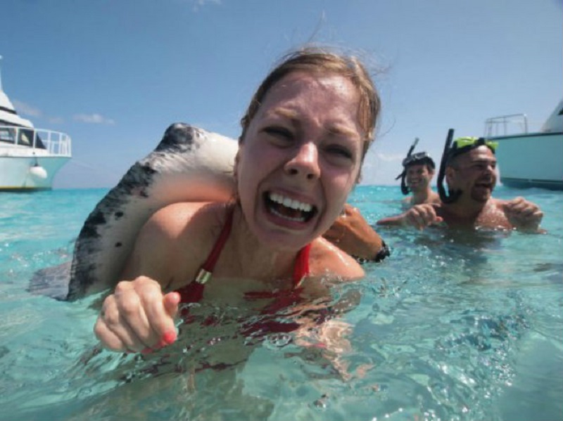 Sting rays don’t normally attack people, except in defense when they’re stepped on. Certain types of rays do, however, leap through the air. Most likely, the ray in this picture meant no harm to the woman he landed on. Scientists speculate rays jumpt to communicate, attract a mate, shake off parasites and or have fun – like the guy behind her.