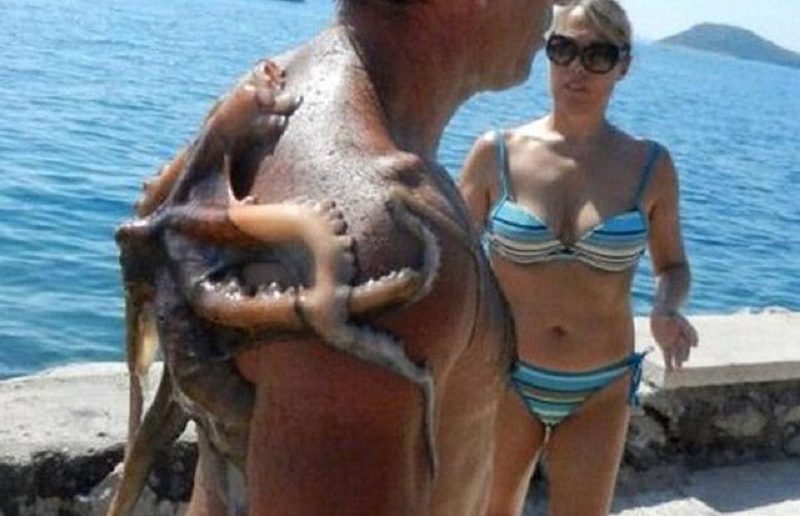 They say the best thing to do if an octopus latches onto you (and you’d rather it didn’t) is to touch its mantle. The mantle is the part many think of as the head of the octopus. These cephalopods are very protective of this part of their anatomy and will often let go of what they’re grasping when it is touched. Hopefully, the man in this picture knew this.