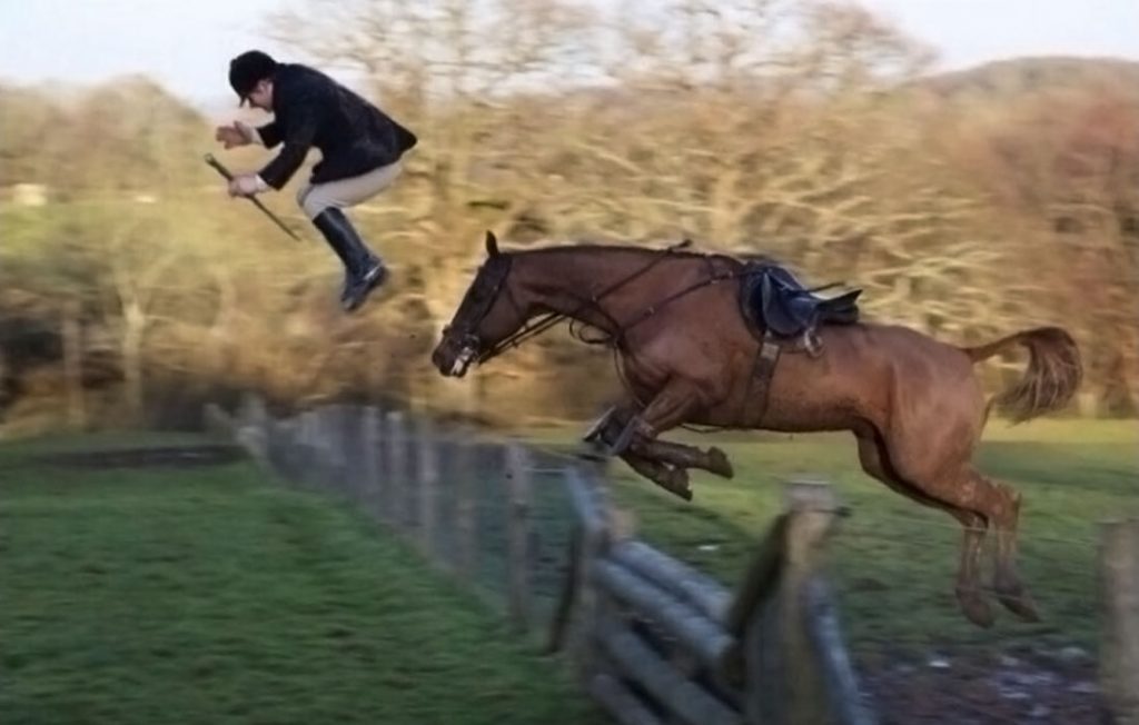 Judging by the rider’s perfect “sitting” posture, this photo was taken less than a second after her hind quarters left the saddle. So, to be fair, she hasn’t had time to think.