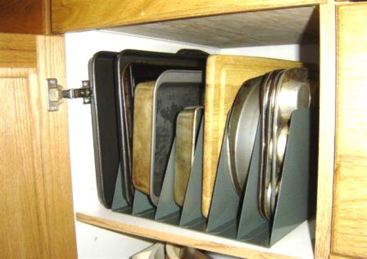 Organize baking sheets, pizza pans, baking rounds, trays, cutting boards, etc. by repurposing a wire, metal or wood file organizer. It provides easy access to every item at a glance and fits into the large under shelf cabinet in your kitchen. You never again have to lift one pan to get to another.