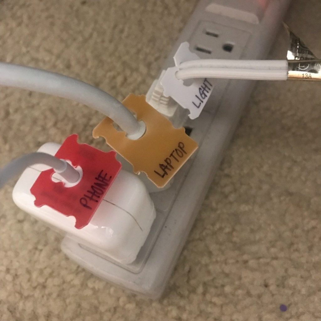 Label your cords in the power strip using plastic bread bag closures. The hearty plastic provides plenty of space to write the name of the appliance. Use permanent marker to create the labels and let them dry thoroughly before attaching them to the cords.