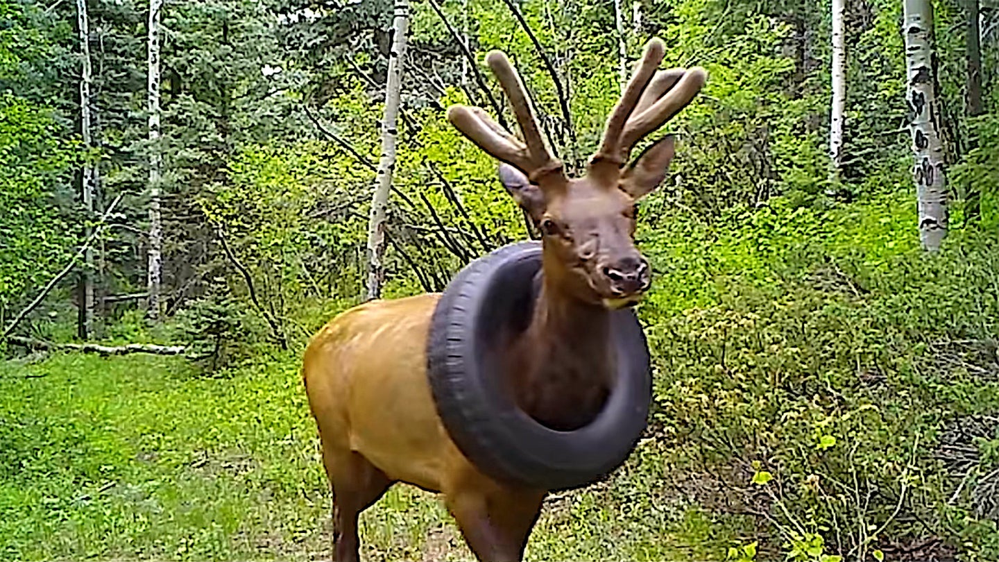 Animals get themselves into all sorts of problems, and elk are no exception. In one particular case, a bull elk managed to get a car tire stuck around its neck and couldn’t then figure out how to get it off. Animals not having the capacity to solve slightly complex problems, the elk ended up carrying the tire around it’s neck for months, maybe even a year or longer. The problem wasn’t even known until Colorado Park and Wildlife rangers saw the creature adorned with a tire during a 2019 survey.