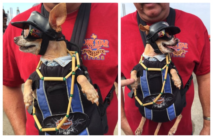There doesn’t have to be a disastrous development in order to make your kids day a little bit brighter. It could be something as easy as a pet pic. Awarded, this pet pic is gold. Eve’s parents were at a motorcycle gathering when they came across the cutest biker chihuahua in a puppy carrier! Safe to say, it made her day colorful.