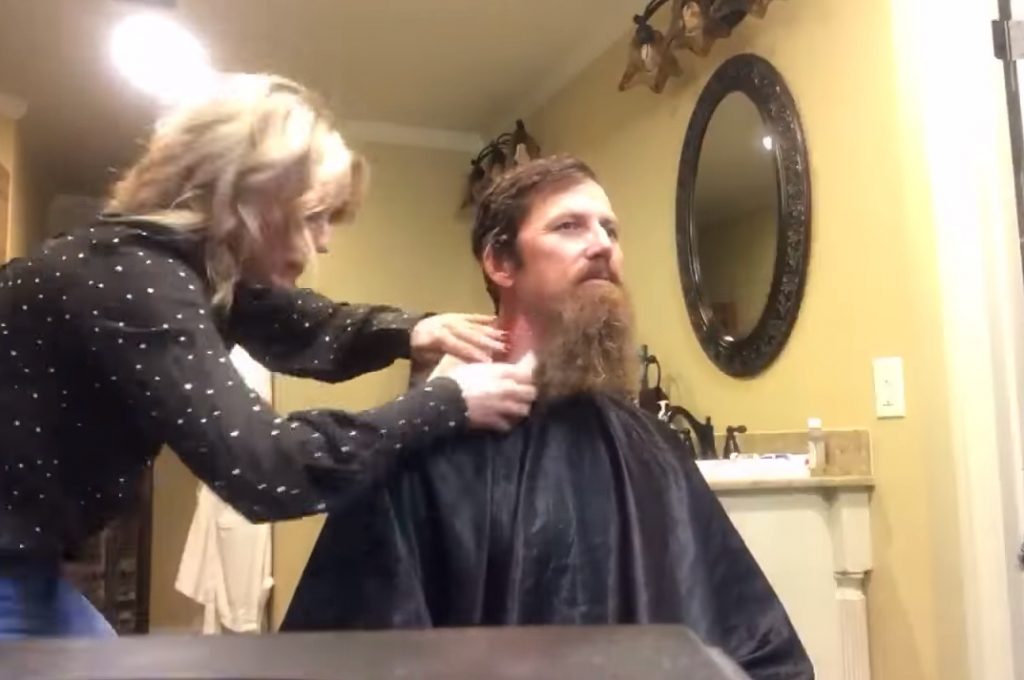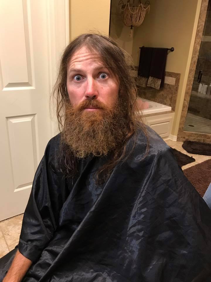 No matter how hesitant Jase might have been, the day of the beard shave was rapidly approaching. This picture showcases Jase just moments before having his iconic mop hacked away. Missy had taken the photo, and she would be there to document the entire event. After having raised so much for the Mia Moo Fund, Jase knew it was time to do his part.
