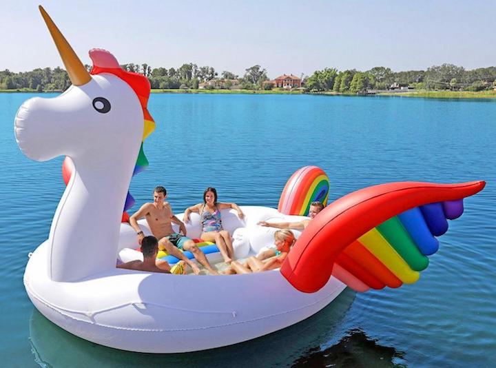 Who says that adults do not believe in fairytales? This giant unicorn is proof that daydreaming can come to life. There are the wings of a rainbow that draw you into this creation. The golden headpiece is what keeps you intrigued. This giant unicorn takes on the form of a boat inside, which means that there is an abundance of room and seating for up to five adults to enjoy. Imagine yourself taking to the lake in this pool float beauty!